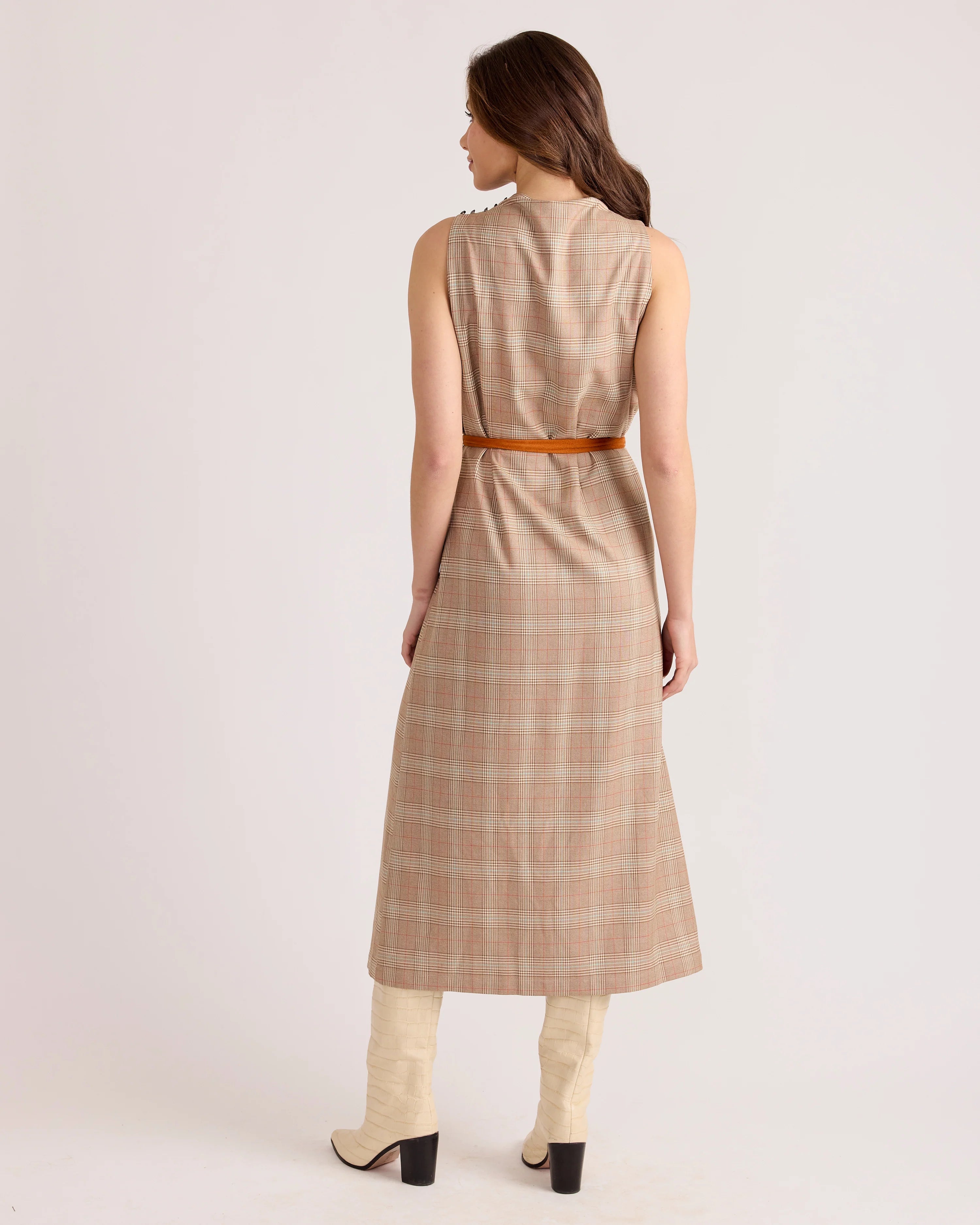 The S’EDGE Clay Dress in Autumn Plaid features a graceful sleeveless design with a soft cowl neck, complemented by a detachable velvet belt to define your silhouette effortlessly. Fully lined for comfort, this dress combines elegance with ease of care—simply machine wash cold and hang to dry to maintain its refined look. Perfect for sophisticated autumn occasions.