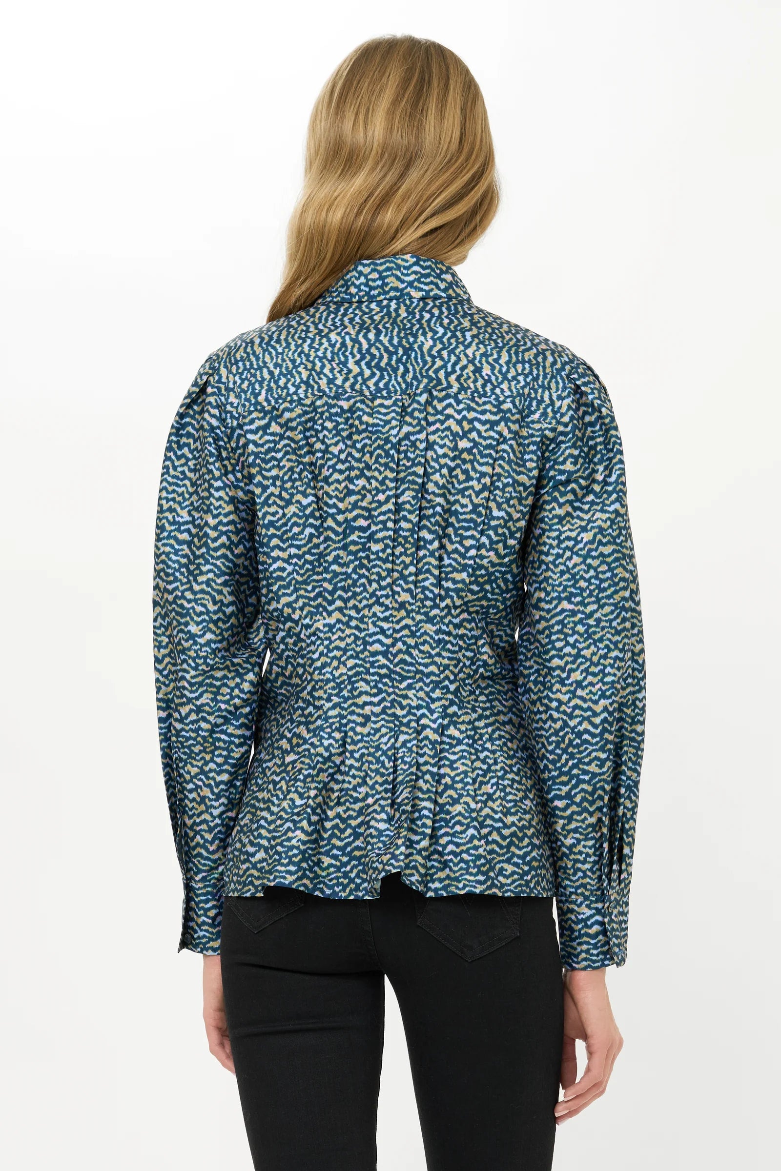 - Soft peplum silhouette with corset pleating throughout bodice and waist