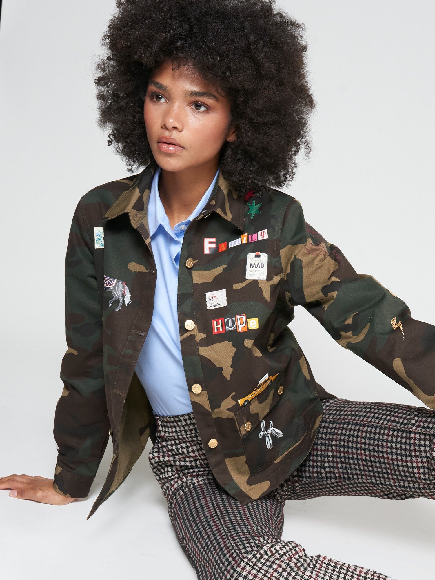 Straight-cut cotton jacket with green and brown camouflage print. Shirt collar and button fastening. Two front flap pockets with gold buttons. Multicolour serigraphy across the front, back and sleeves featuring graphic elements such as hearts, butterflies, dice, fruit, animals and playful symbols in various sizes and styles.