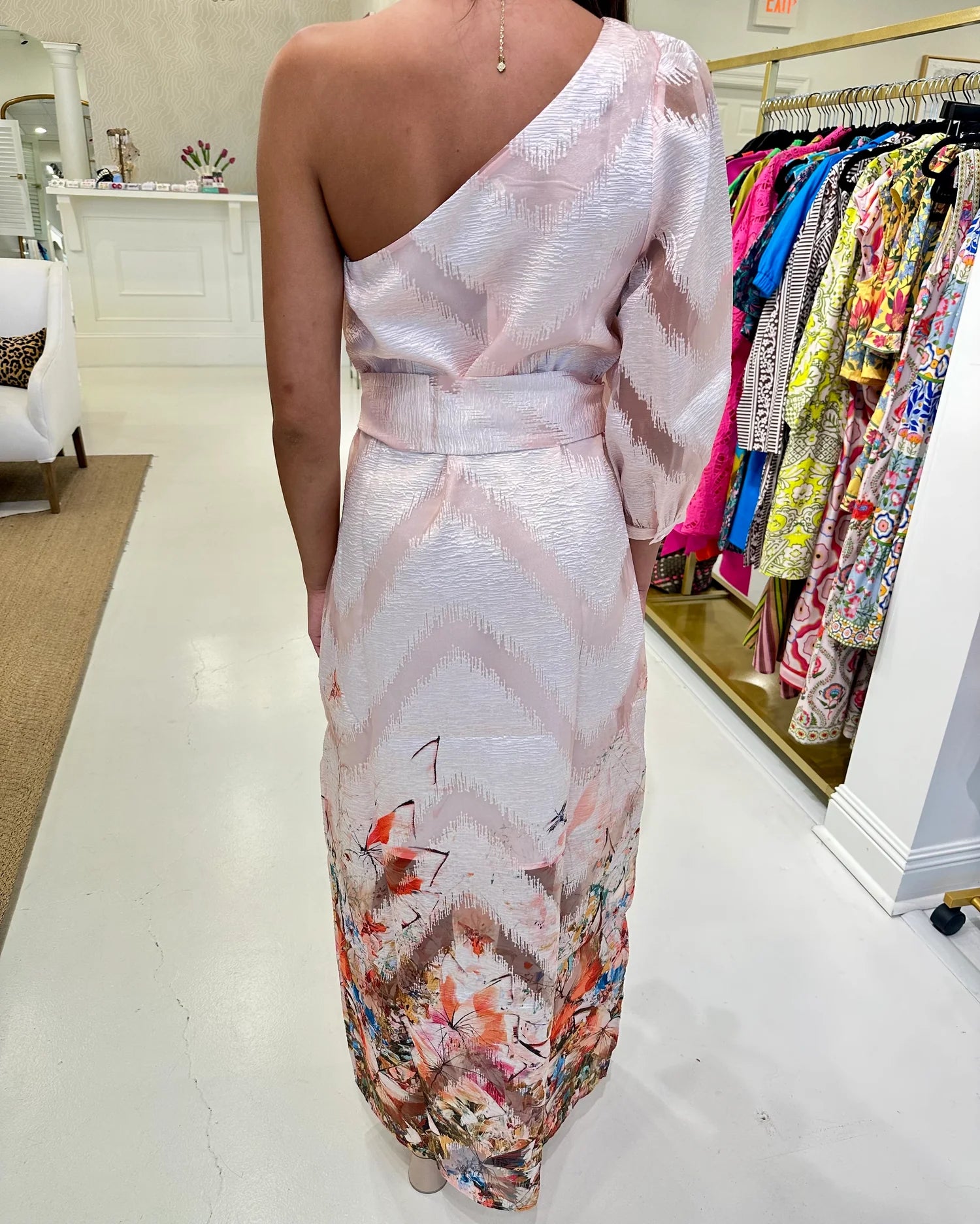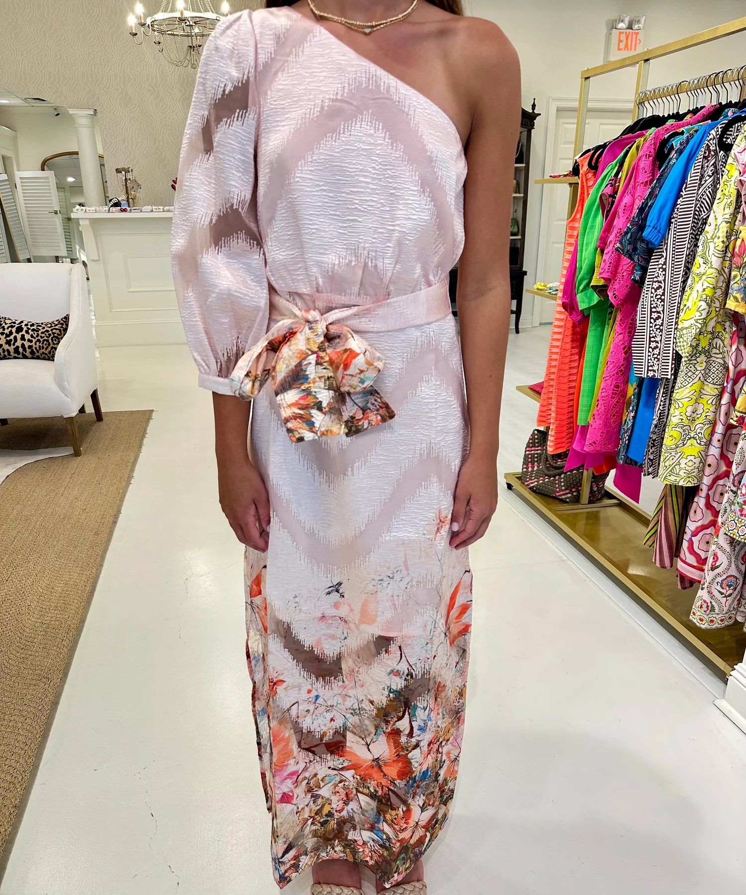 Turn heads in our Butterfly One-Shoulder dress, a statement piece that blends elegance with effortless charm. This one-shoulder silhouette features a soft blush pink base with textured detailing across the bodice and sleeves. The waist is cinched with a matching tie belt for a flattering fit. Beautiful and breezy, this dress is perfect for weddings, brunches, or summer strolls—wherever your style takes you. Fits true to size.