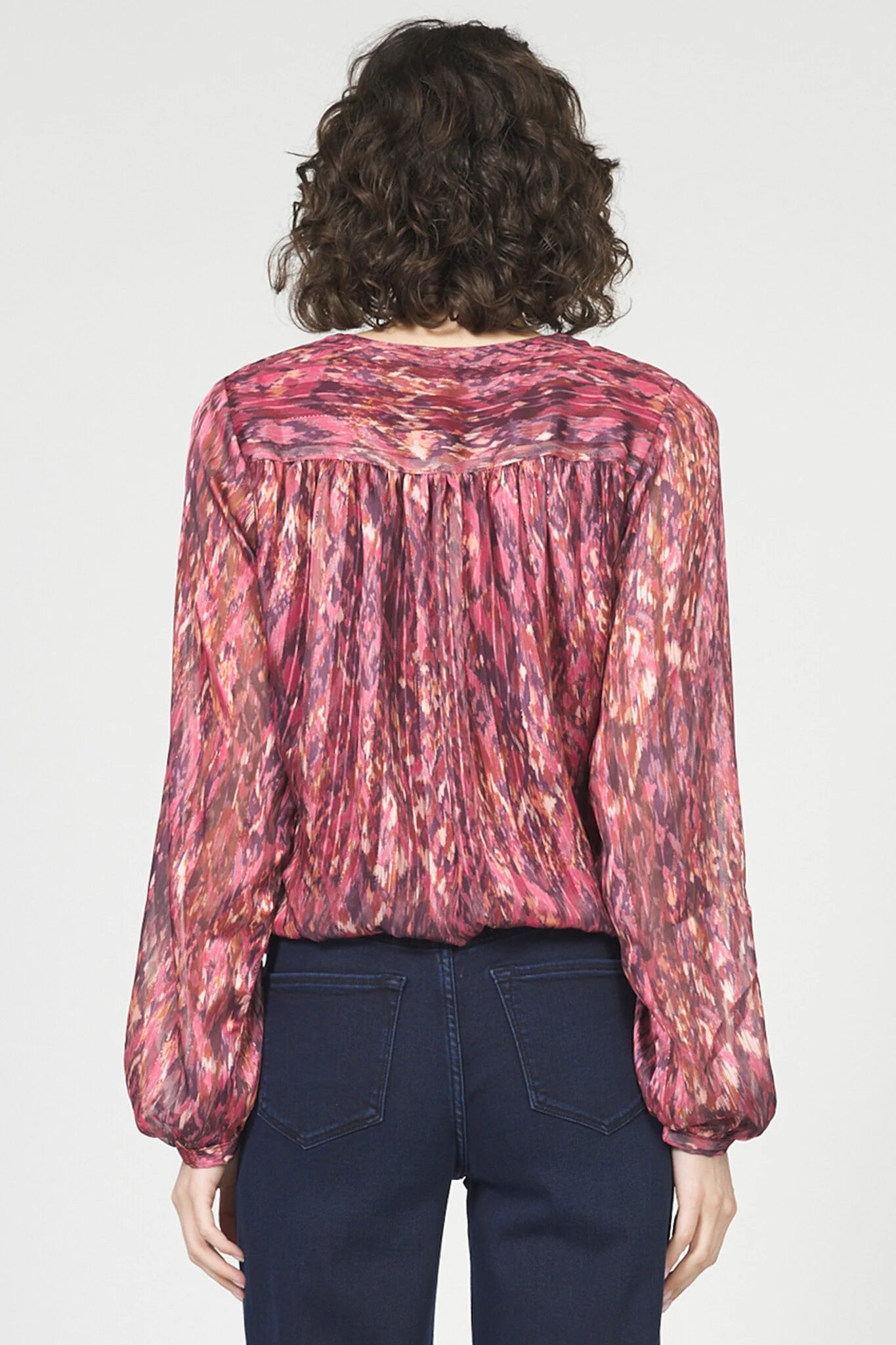 Turn up the charm and let your confidence shimmer in the Piaf Blouse — a breathtaking swirl of rich pomegranate, berry, and rose flame hues that dance like a sunset on silk. Features a smocked V-neckline, blouson sleeves, and flowy silhouette.