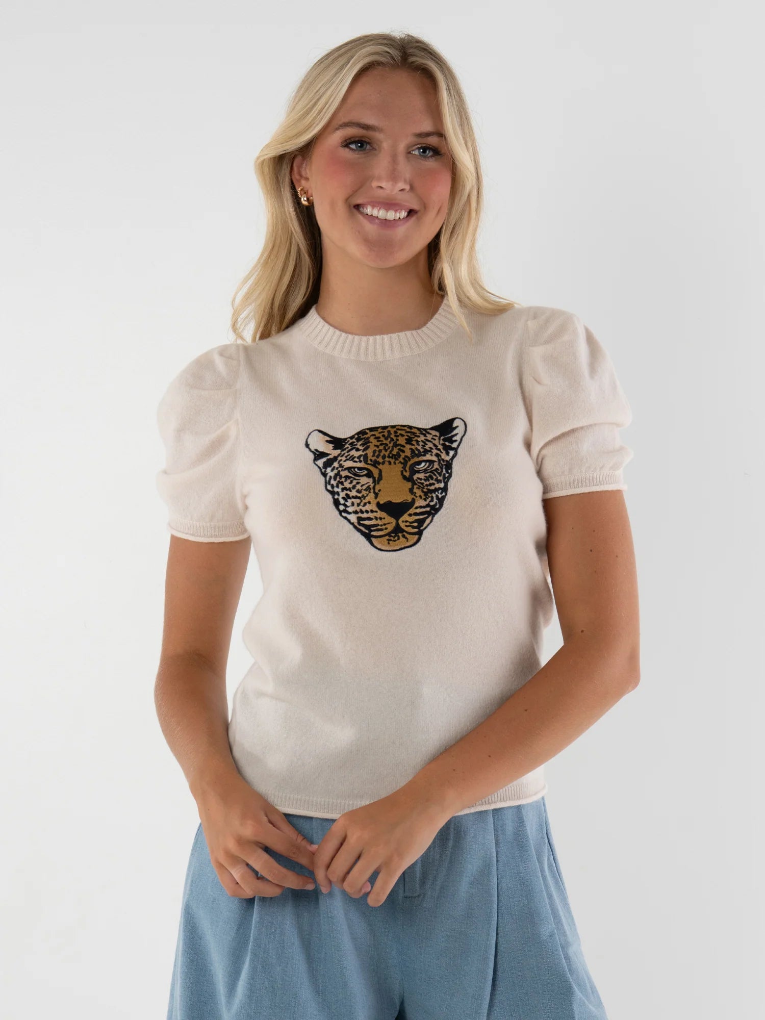 The Crewneck Knit in Sandshell is a refined statement crafted from 100% cashmere for an ultra-soft, elevated feel. Designed with a relaxed silhouette and subtle puff sleeves, this piece blends comfort with thoughtful shape. A bold cheetah graphic embroidered at the front adds a modern edge, bringing fierce personality and polish to this timeless knit.
