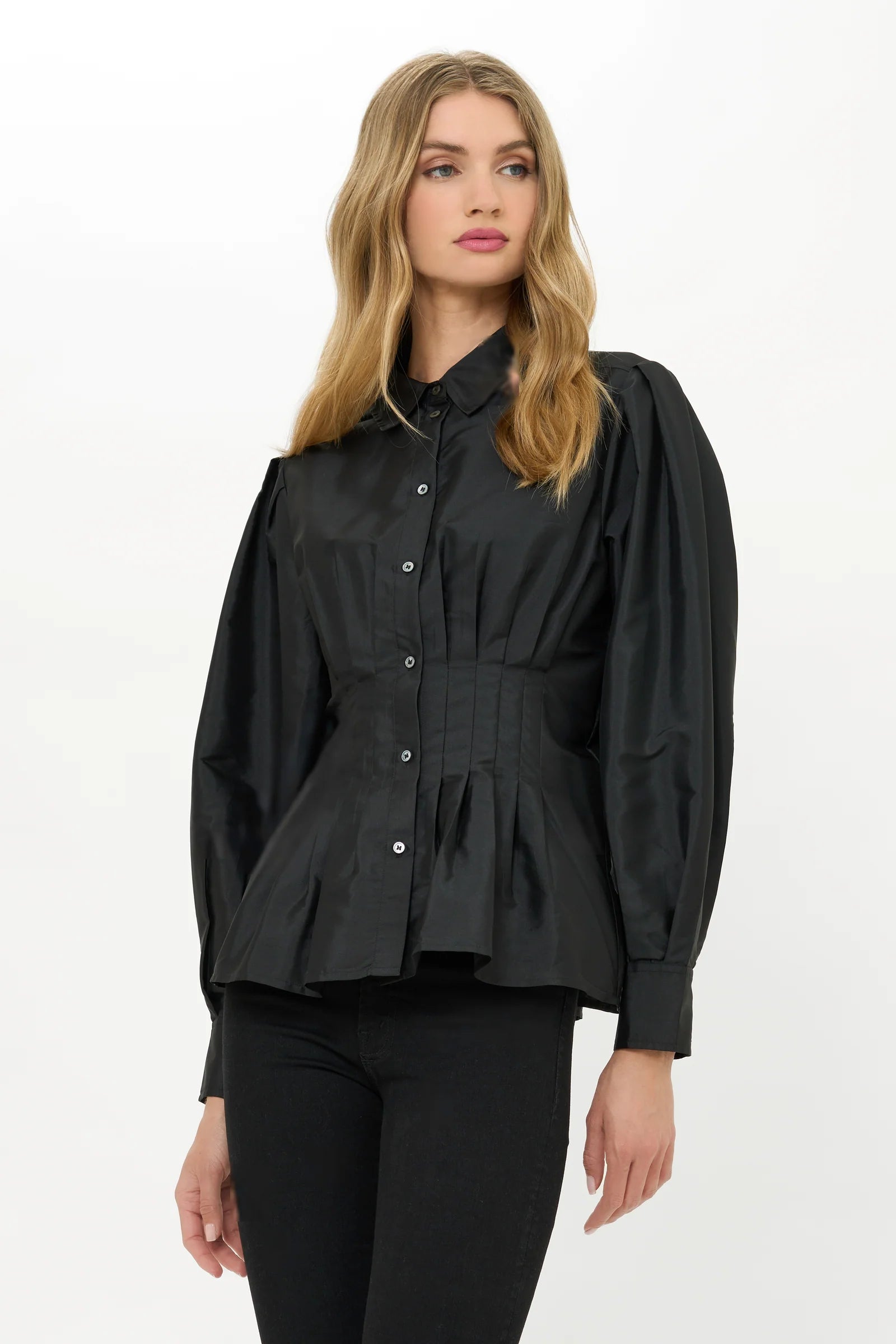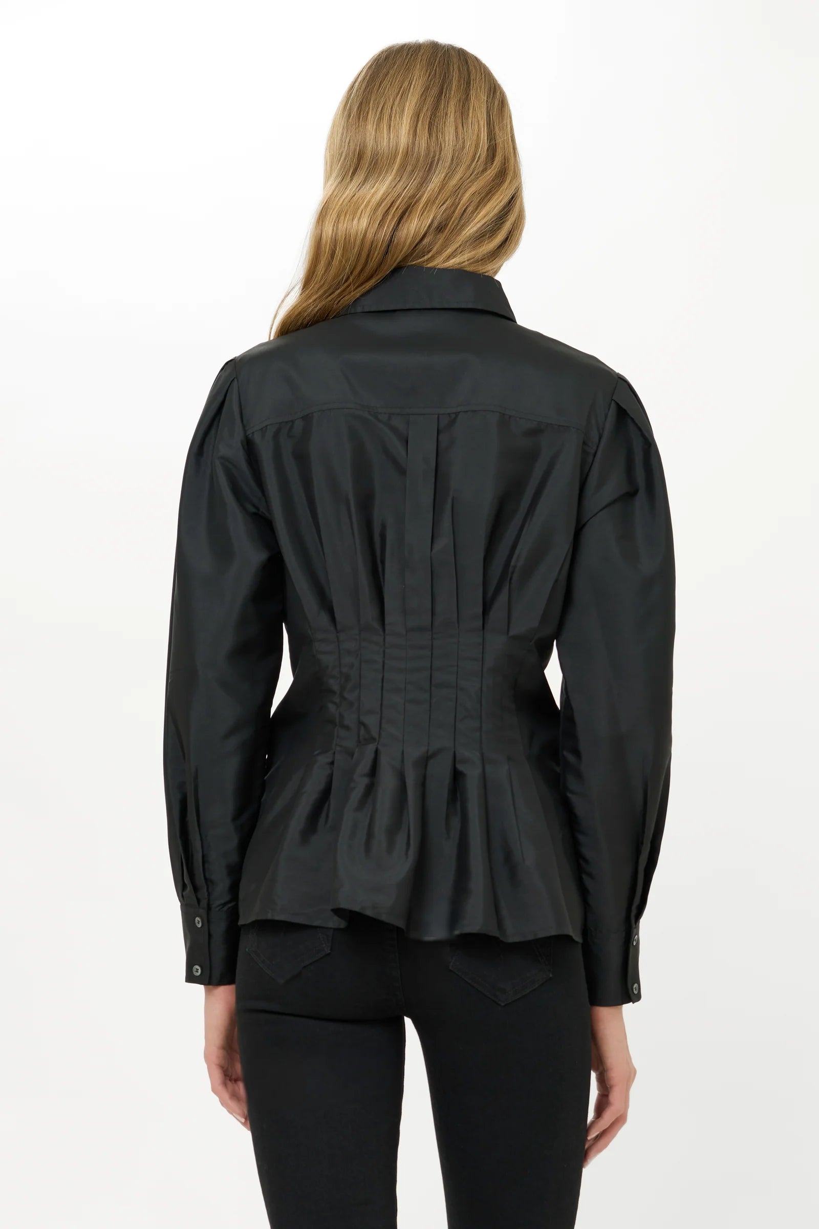 • Soft peplum silhouette with corset pleating throughout bodice and waist