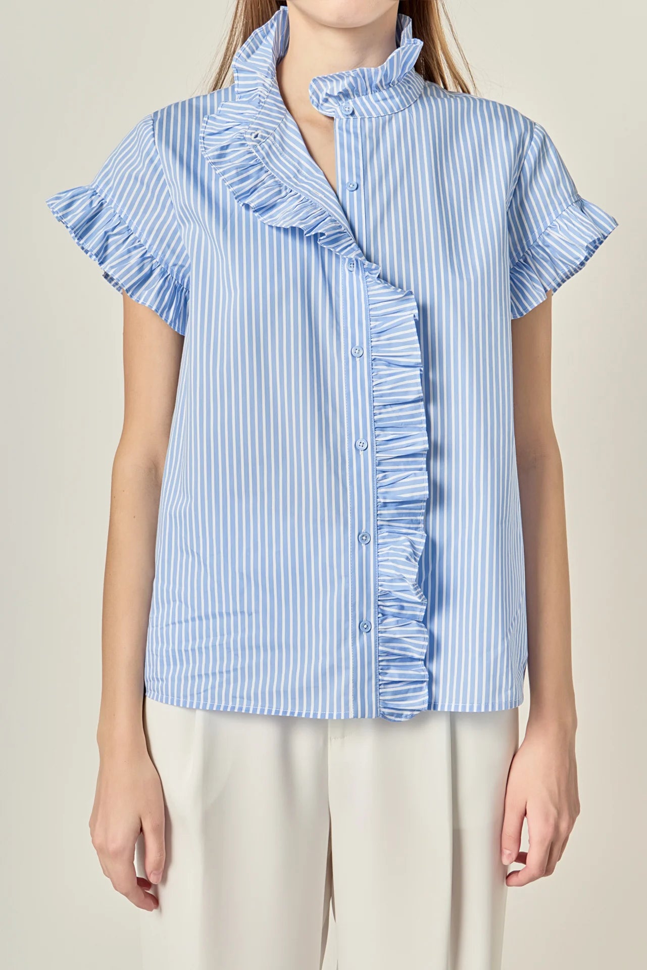 Add a refined yet playful touch to your everyday wardrobe with this Ruffle Trim Striped Button-Up Shirt. Designed with delicate ruffle trim along the stand collar and sleeves, this piece blends classic tailoring with feminine detail. The crisp stripe pattern gives it a timeless feel, while the relaxed silhouette keeps it effortless and easy to wear. Finished with a button-front closure, this shirt transitions seamlessly from casual days to polished looks. Pair it with denim for a laid-back vibe or style it with tailored bottoms for a chic, put-together outfit.